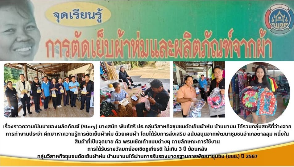 กรมการพัฒนาชุมชน มอบให้สำนักงานพัฒนาชุมชนอำเภอ ดำเนินการคัดเลือกศิลปินOTOPเพื่อยกย่องเชิดชูเกียรติ ผู้ผลิต ผู้ประกอบการ OTOP โดยสำนักงานพัฒนาชุมชนอำเภอตาลสุม ได้คัดเลือกนางสนิท พันธ์ศรี ปธ.กลุ่มวิสาหกิจชุมชนเย็บผ้าห่ม บ้านนามน หมู่ 5 ตำบลตาลสุม